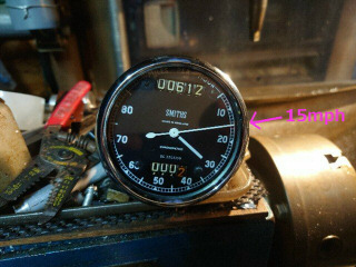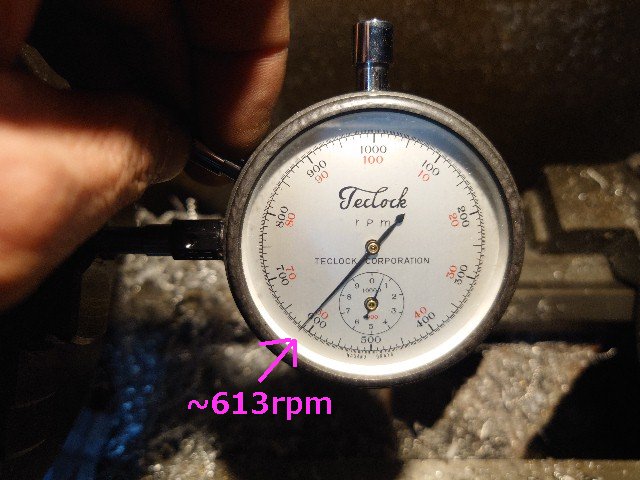早速、旋盤で500rpmでテストします。20mph弱を指しています。多分、1600TPMと思われます。クリックすると、短い動画をダウンロードします。