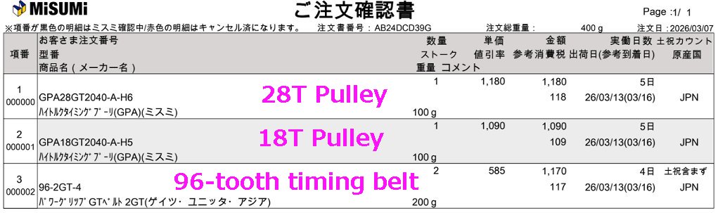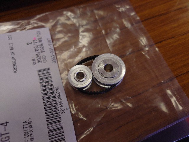 頼んで、ミスミで注文してもらいました。18Tプーリはシャフト径が5mmなので、6mmで開け直しが必要です。