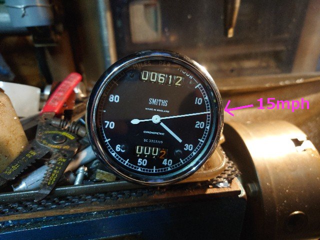 トライトンのスピードメータケーブルの回転数は60mph(96km/h)の時に2490rpmです。613rpmは約2490rpmの1/4です。なので、60/4=15mphで合っています。