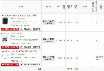 モノタロウでオイル、オイルフィルタとオルタネータ用のミシンベルトを注文しておきました。