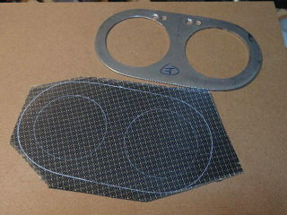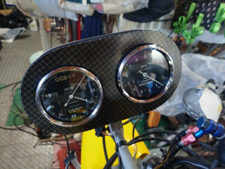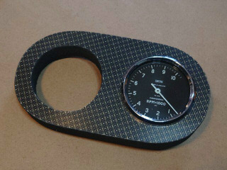 カーボン板はゴム系の接着剤で貼り付けて、外形とメータ穴を仕上げました。