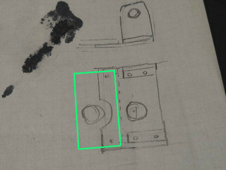 をしておきました。緑枠は今あるケーブル入力軸です。新しくプーリの軸を取り付けるステーを追加して2軸にします。3mm厚のL字アルミチャンネルから作製します。ベルトのテンションが調整できるようにする必要があります。