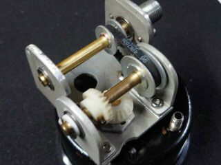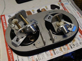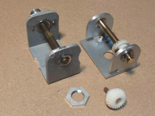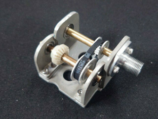 クロノのスピードメータのタイミングベルト減速機構の続きです。90度変換ギア/プーリホルダを作製しました。右側が新しく作ったホルダです。シャフトは6mmの真鍮製で両端はミニチュアベアリングです。左側は元々はスミスのタコメータ用の90度変換ギアホルダです。部品は全て以前作ったときの予備がありました。