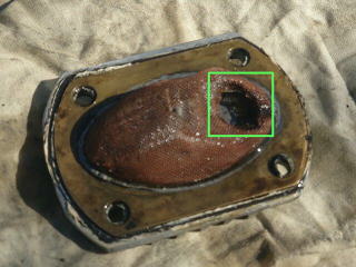 ドレン/簡易フィルタを外すと、クランクケースからも少しオイルが出てきます。網フィルタは緑枠のスカベンジパイプとの隙間が多く、効果的に働いていないように思います。