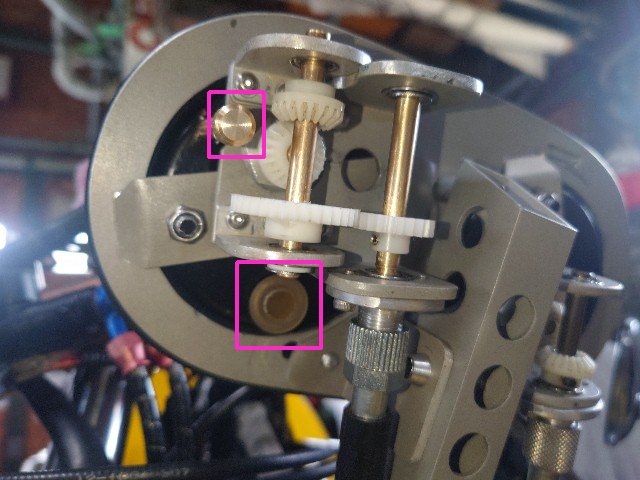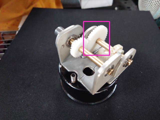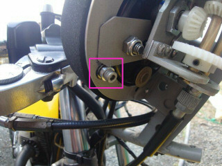 車体にギア減速機構とスピードメータを取り付けました。下の赤枠の照明穴は外部照明を使うので使わないことにして、ウレタンゴム作ったキャップで塞ぎました。上の赤枠は真鍮棒で作ったトリップメータのリセットノブです。