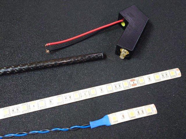 クロノメータの外部照明の続きです。3Dプリンタで作製したブラケットはT10バルブに合わせて作製しましたが、思ったよりサイズが大きいので、テープLEDをフロントのクリアスクリーンに貼る方法を試してみます。アマゾンで購入したLEDをLED3個分に短くして、配線を目立たない色に変更しました。因みに、3個毎に切断できます。