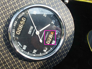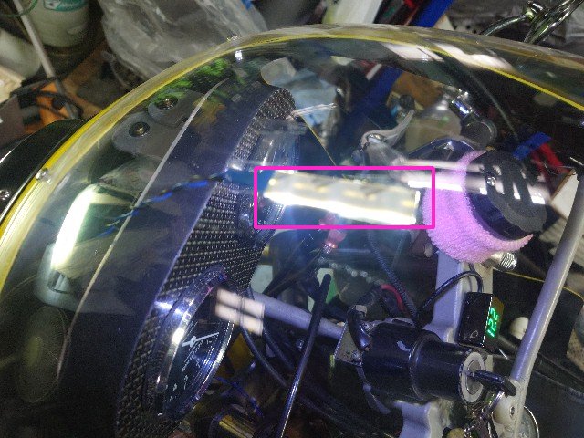 メータに照明が当たって、メータのガラスにLEDは見えず、貼る位置はいいようです。周囲が明るいので範囲は不明なので、暗い時に再確認します。