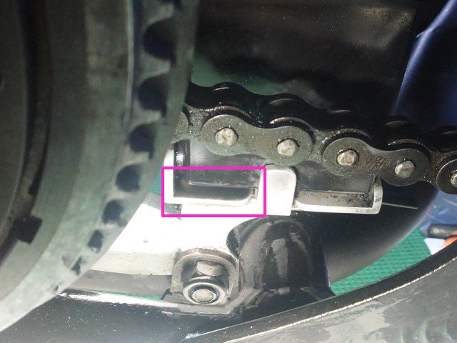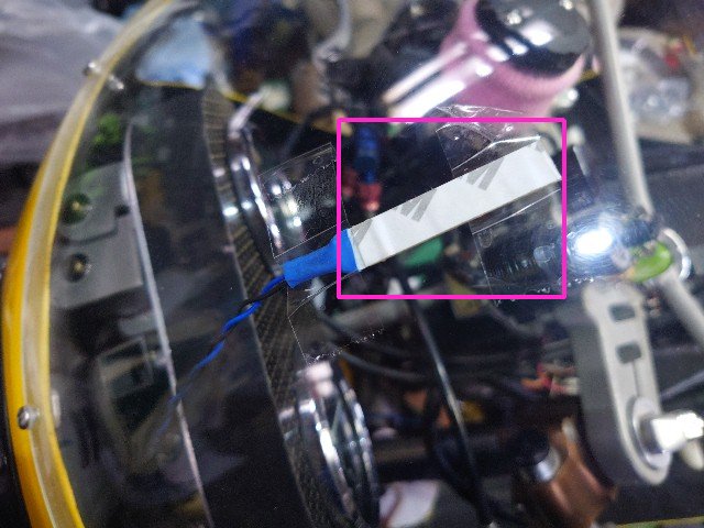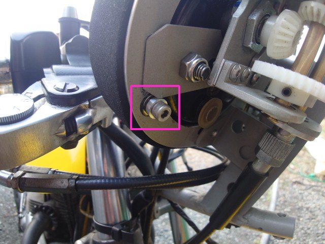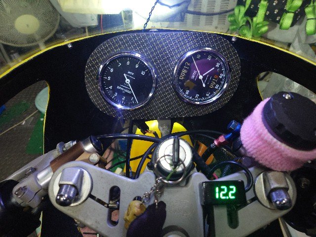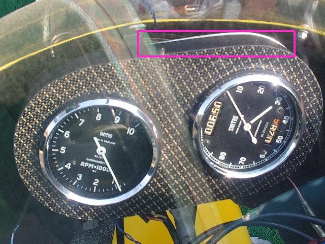 戻ってきて気が付きましたが、スピードメータが防振のスポンジゴムと一緒に赤枠のように下がっています。クロノメトリックは重いので、軽い電磁式と同じ保持方法では下がってきてしまうようです。特に、スピードメータは押さえプレートが水平なので、下がりやすいと思います。