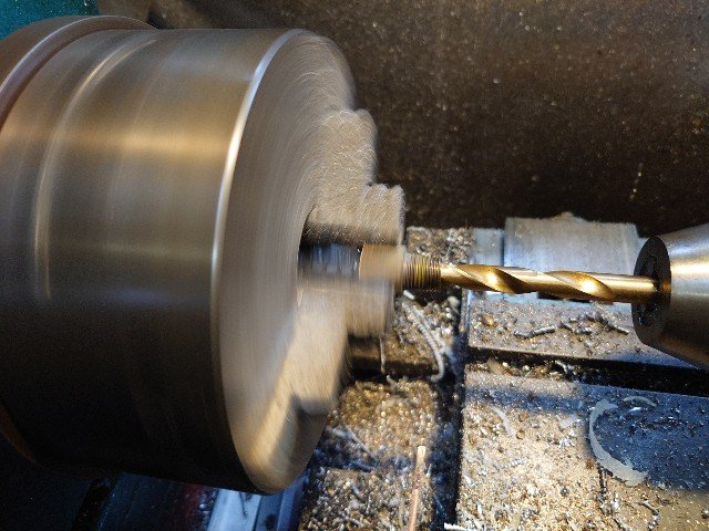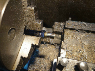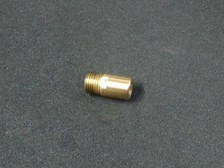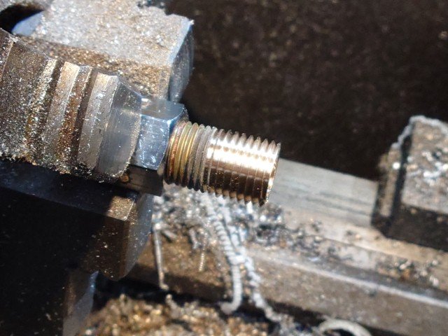 現在、タンクには1/4のテーパのバルブが付いています。手持ちの空気配管用の1/4テーパの付いている真鍮部品を改造して14mm、ピッチ1.5mmのアダプタを作製します。余分な部分を削って、旋盤で14mmピッチ1.5のネジを切って、変換アダプタが完成しました。