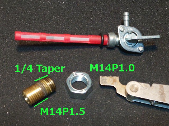燃料コックが到着しました。作製した変換アダプタを合わせてみましたが、残念ながらピッチが1.5ではなく、1.0でした。商品説明にはピッチ1.5と書いてありましたが(泣)。ピッチ1.0にピッチ1.5の変換アダプタを入れると、1周しか回らないです。使えない