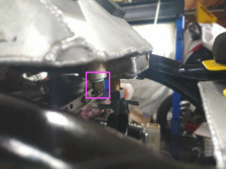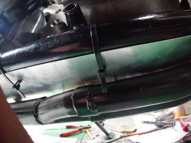 早速、タイラップでフレーム下に取り付けてみます。オイルがエキパイにかからなくなって、白煙が防止できると思います。ウエスを追加して、流れてきたオイルを吸収するようにした方がいいです。