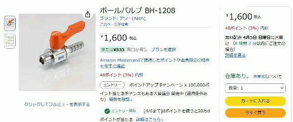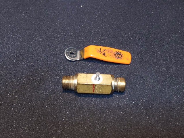 元々ついていたのと同じような1/4テーパのボールバルブを発注しました。出力側は8mmのニップル仕様です。