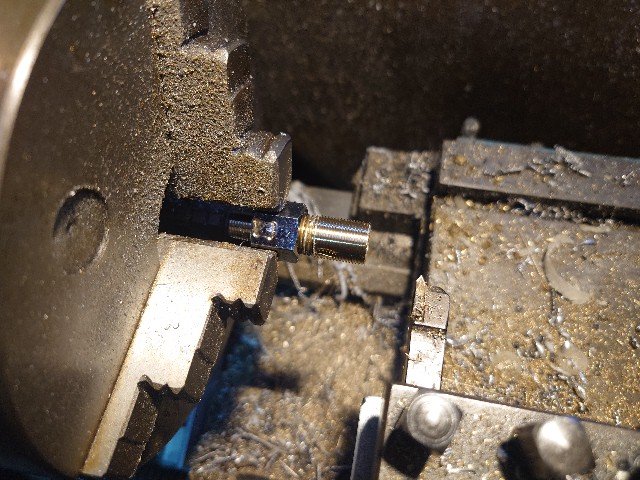 外径を13.8mmにして、ねじ切りって、12mmの薄スパナが入るように溝を作ってアダプタが完成しました。