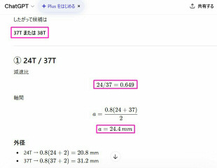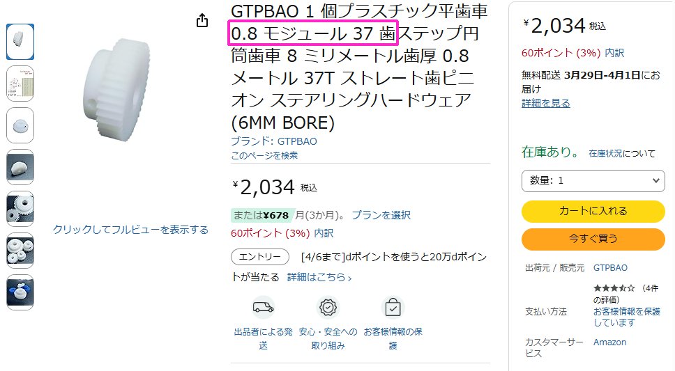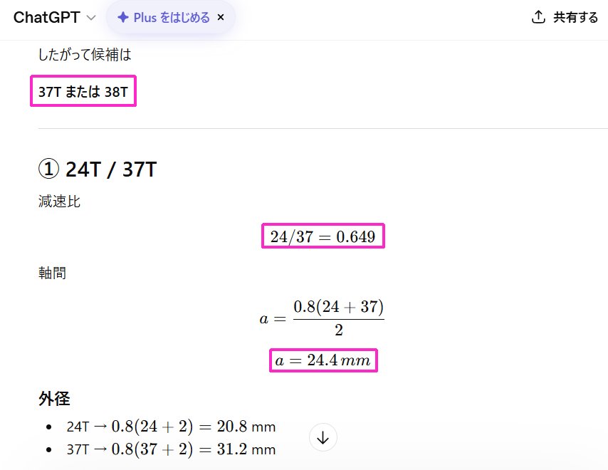 スピードメータのタイミングベルトの減速機構は回転が逆でした(泣)。昨日、ケーブルが外れている状態で、車体を移動させていて気が付きました。ギアを使うと反転するので、タイミングベルトを使いましたが、反転してよかったです(笑)。モジュール0.8のプラスチックギアの24Tの手持ちがあるのでchatgptに軸間が25mmで片側のギアを選定してもらうと37Tでした。