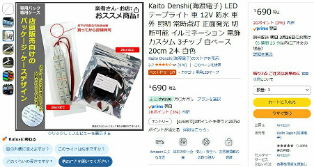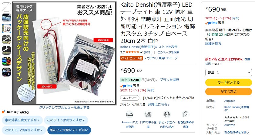今回購入のテープLEDです。12V、白色、20cmが2本で690円です。