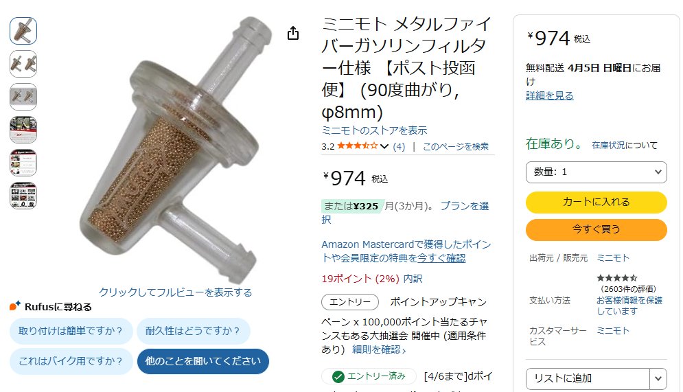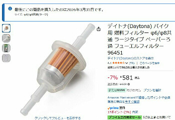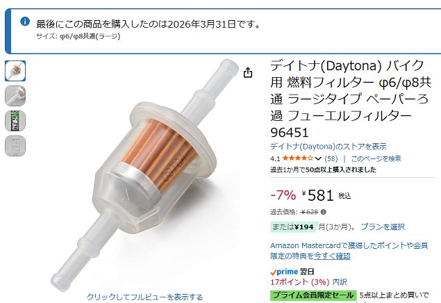 新しい燃料フィルタが到着したので、付けてみましたが、いまいち流量が少ないです。動画ではフィルタが下に向かっていますが、実際に取り付けるとスペースの関係で水平になり、さらに流量が減ります。コックとホースの径が細いのと
