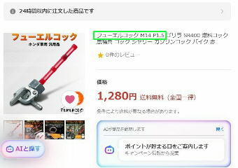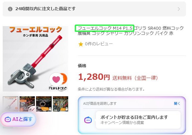 今のガソリンタンクのコックはリザーブ(予備タン)のポジションが無いため、リザーブ付きの燃料コックを発注しました。取り付けネジは14mm、ピッチ1.5mmを選びました。