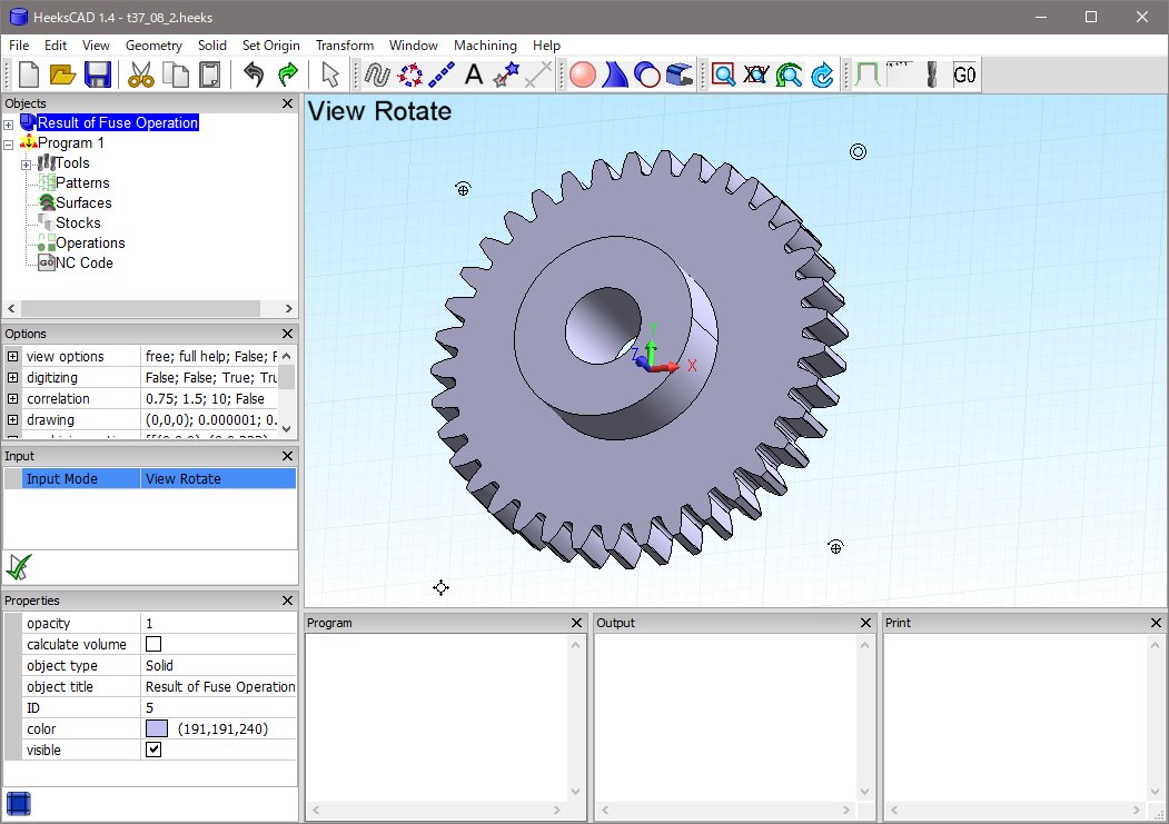 37Tは中途半端な丁数のようで、通販で直ぐに買えるものが見つからないです。今回は臨時に3Dプリンタで作製しましす。HeeksCNCは簡単にギアが作れます。モジュール0.8の37Tの3Dモデルを作製しました。