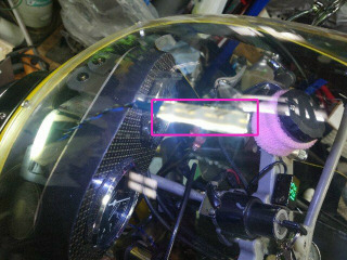 クリアスクリーンにテープで仮止めします。ヘッドライト点灯させると、テープLEDも点灯します。