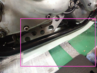 オイルがエキパイに直接かからないように、フレームとエキパイの間に遮蔽板を入れてみます。0.5mmのアルミ板を発注しました。